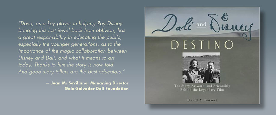 “It is truly an amazing sight when giants collide. Sometimes, they fight. Sometimes, they make beautiful art together. Dave Bossert gives us a delightful glimpse into two spectacular lives. Few know that the splendiferous surrealist painter, Salvador Dalí and the towering American icon, Walt Disney, collaborated to make the Destino film. Bossert’s book is a compelling and mirthful behind-the-scenes look at genius, hijinx, American culture and these two seemingly worlds-apart epic souls.”