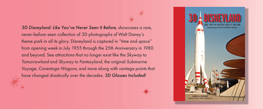 “The exceptional stereo images on the pages of Dave Bossert’s 3D Disneyland: Like You’ve Never Seen It Before transported me back to the excitement I felt like a wide-eyed kid on Park Opening Day in July 1955. These immersive photos showcase a park ever-changing, adding new attractions over the decades. Each of the 3D images, never before published, are windows on Disneyland in remarkable realistic depth. For Park fans of all ages, here is your Fast Pass to skip the queue line. Reach out and touch the excitement of 3D Disneyland!”
