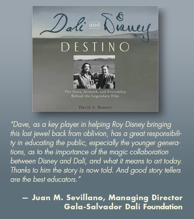 “It is truly an amazing sight when giants collide. Sometimes, they fight. Sometimes, they make beautiful art together. Dave Bossert gives us a delightful glimpse into two spectacular lives. Few know that the splendiferous surrealist painter, Salvador Dalí and the towering American icon, Walt Disney, collaborated to make the Destino film. Bossert’s book is a compelling and mirthful behind-the-scenes look at genius, hijinx, American culture and these two seemingly worlds-apart epic souls.”