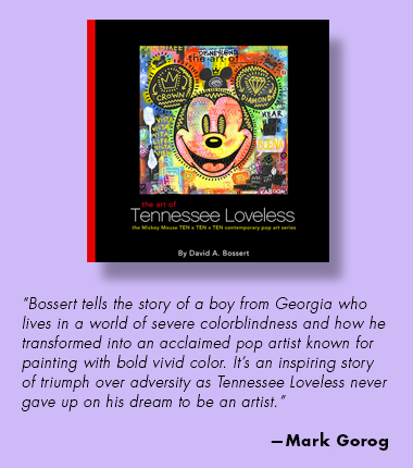 “The Art of Tennessee Loveless: The Mickey Mouse TEN x TEN x TEN Contemporary Pop Art Series book by David A. Bossert tells the story of a boy from Georgia who lives in a world of severe colorblindness and how he transformed into an acclaimed pop artist known for painting with bold vivid color. It’s an inspiring story of triumph over adversity as Tennessee Loveless never gave up on his dream to be an artist. I particularly enjoy the details in many of the paintings, look closely at “Waltopia” and you will find the entire life story of Walt Disney in one painting.”