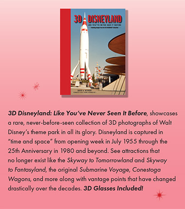 “The exceptional stereo images on the pages of Dave Bossert’s 3D Disneyland: Like You’ve Never Seen It Before transported me back to the excitement I felt like a wide-eyed kid on Park Opening Day in July 1955. These immersive photos showcase a park ever-changing, adding new attractions over the decades. Each of the 3D images, never before published, are windows on Disneyland in remarkable realistic depth. For Park fans of all ages, here is your Fast Pass to skip the queue line. Reach out and touch the excitement of 3D Disneyland!”