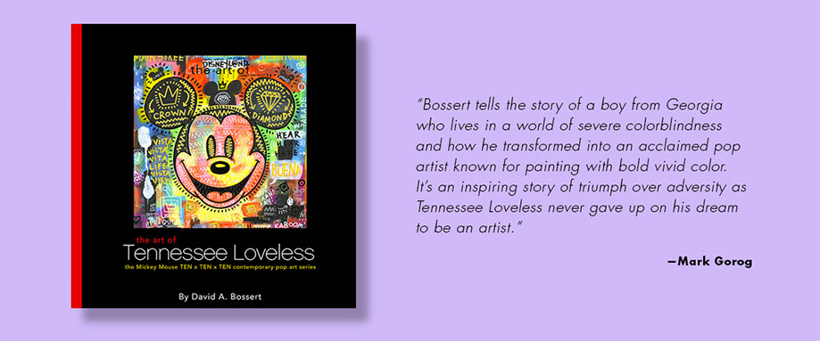 “The Art of Tennessee Loveless: The Mickey Mouse TEN x TEN x TEN Contemporary Pop Art Series book by David A. Bossert tells the story of a boy from Georgia who lives in a world of severe colorblindness and how he transformed into an acclaimed pop artist known for painting with bold vivid color. It’s an inspiring story of triumph over adversity as Tennessee Loveless never gave up on his dream to be an artist. I particularly enjoy the details in many of the paintings, look closely at “Waltopia” and you will find the entire life story of Walt Disney in one painting.”